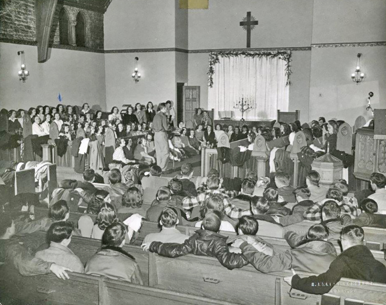 This 1948 photo, provided by former Grandview resident Jeanne Jones Holder, shows Lowell Riley directing a practice with the FCC Cloister Choir in the original church building. As she describes it, “the boys were watching the practice while they waited to walk the girls to their homes.”